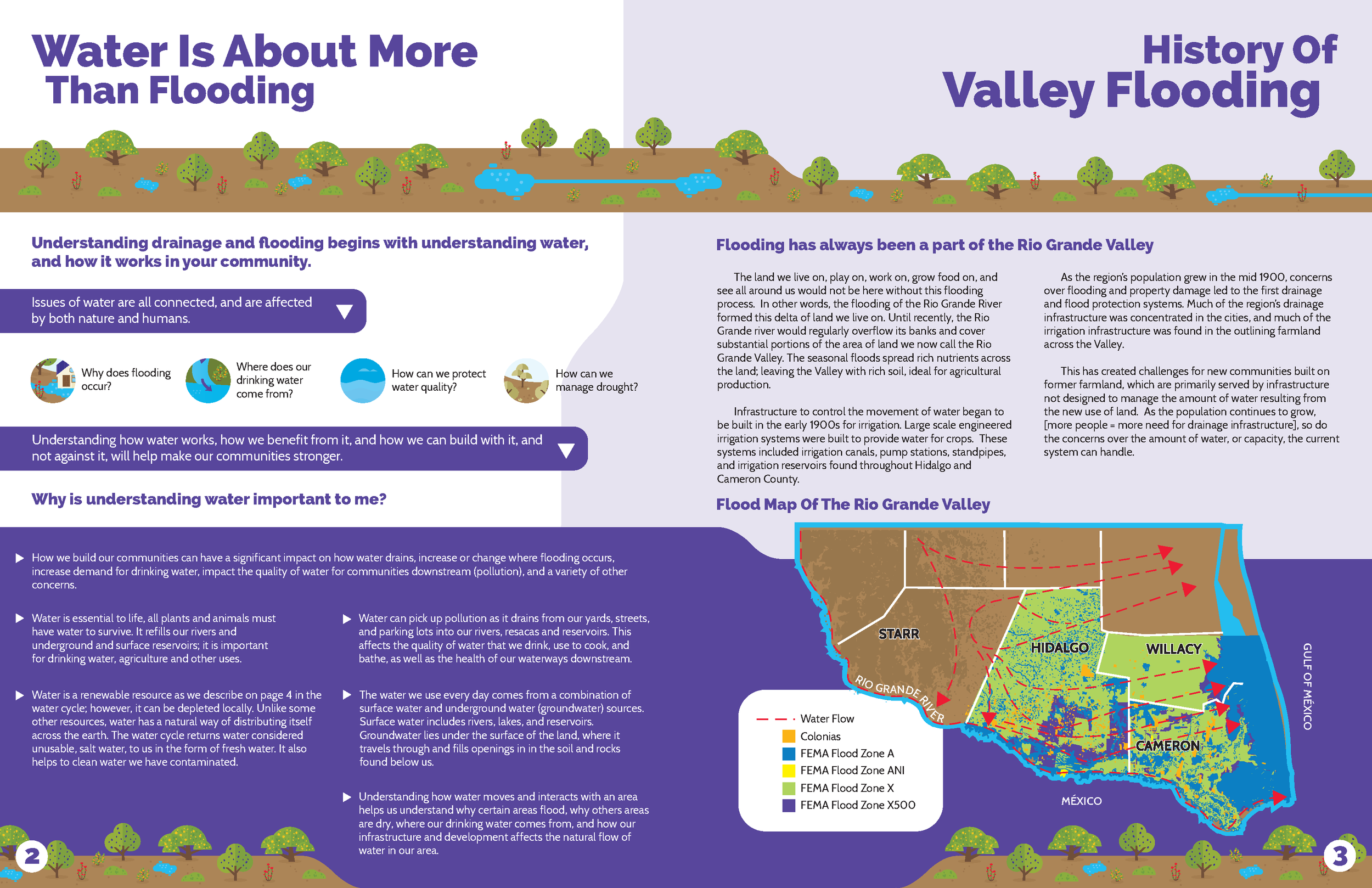 “Why does my neighborhood or do parts of the valley flood?” Flooding can be caused by a variety of different reasons. In the first level of the drainage module, readers learn about the water cycle and conditions in the Lower Rio Grande Valley that make it especially prone to flooding. By learning to identify different causes of flooding, readers can begin to understand which drainage solutions to advocate for in their neighborhoods.